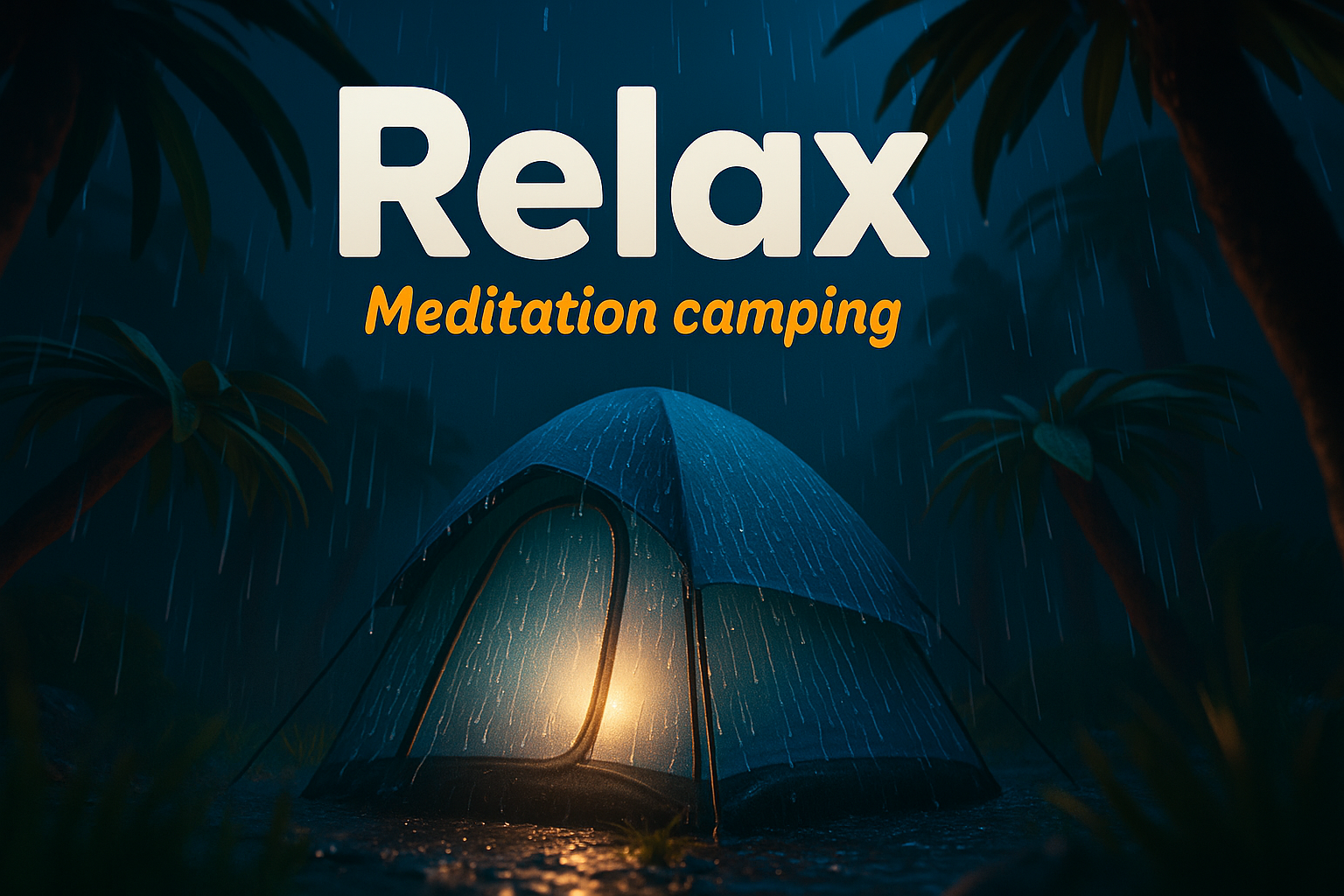 A serene scene depicting a tent in a tropical forest during a calm rain. The atmosphere is peaceful, promoting relaxation and meditation amid the gentle rain.