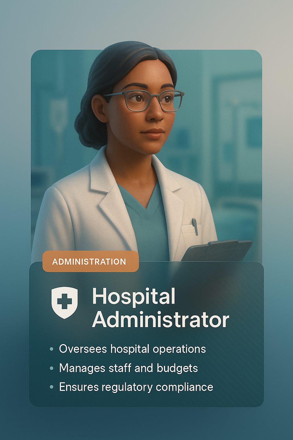 A 3D illustration of a Hospital Administrator showcasing a professional look. The design includes a layered structure with a gradient background and a cohesive integration of text and icon elements.