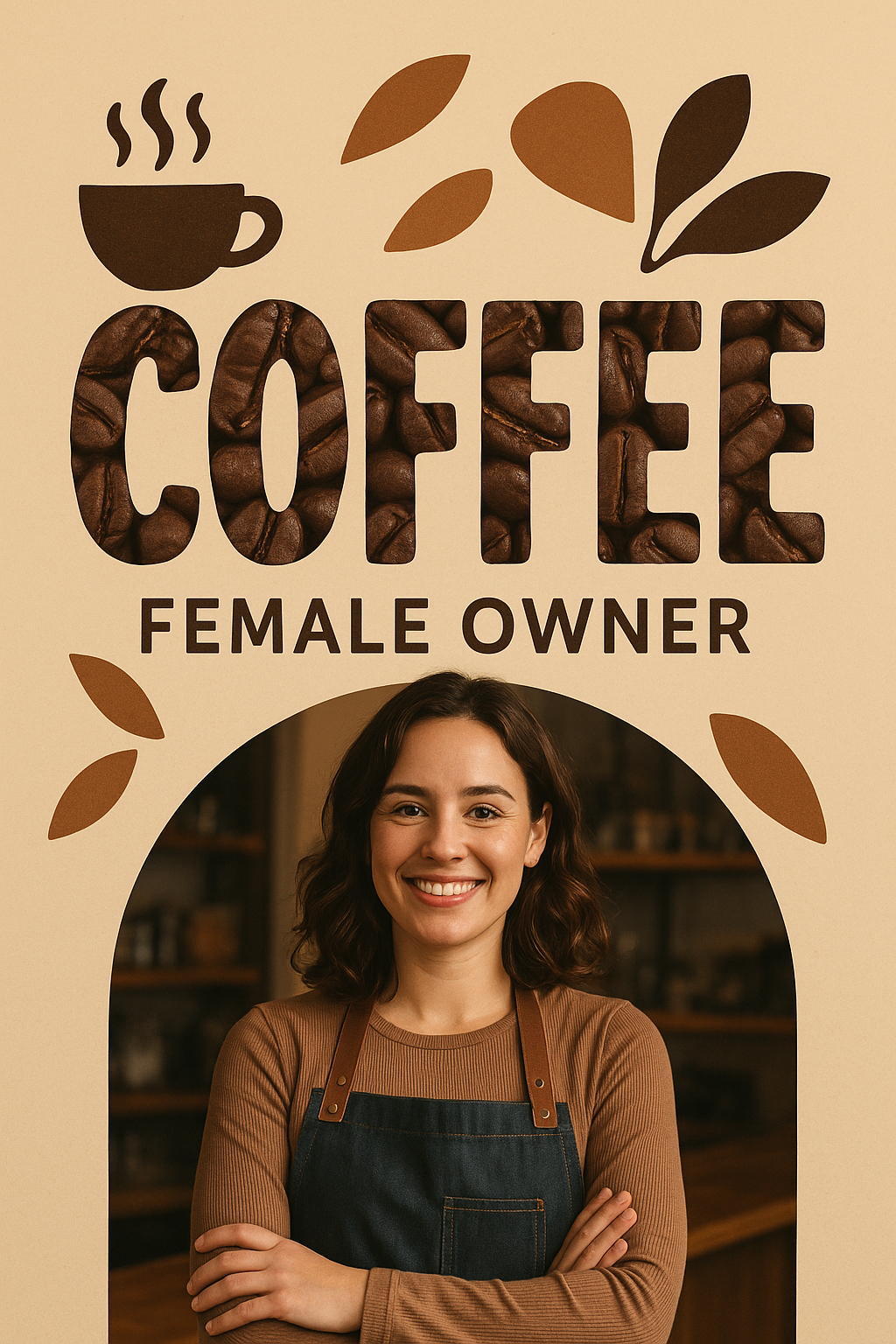 Engaging coffee shop promotional graphic showcasing a female owner, designed with warm tones and coffee-themed elements, ideal for marketing and branding.