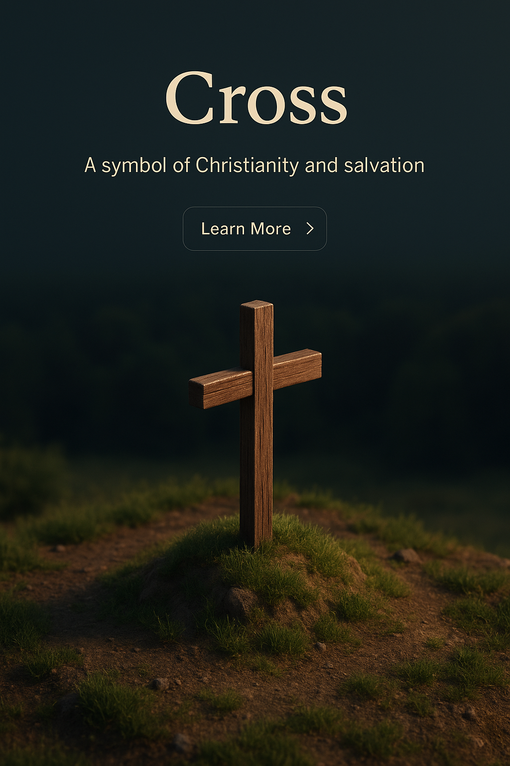 A beautifully crafted 3D scene featuring a wooden cross on a grassy mound, set against a dark gradient background. The design includes a small label, a brief header, and a call-to-action button.