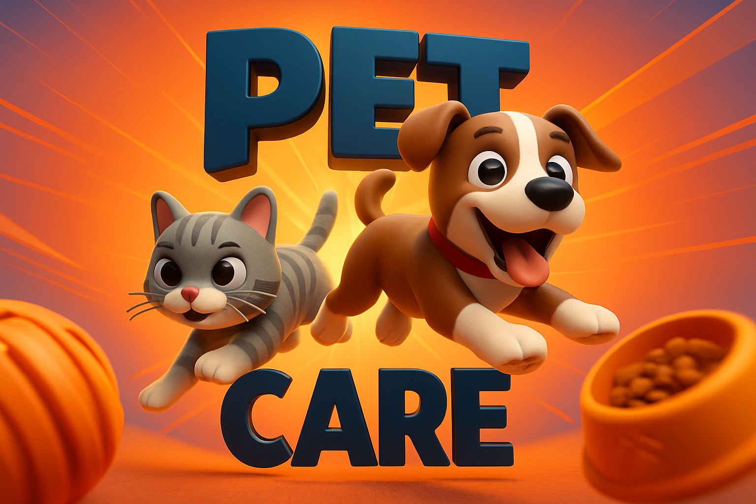 A vibrant 3D illustration featuring a playful dog and cat, emphasizing pet care. The dynamic background radiates energy, enhancing the lively theme.