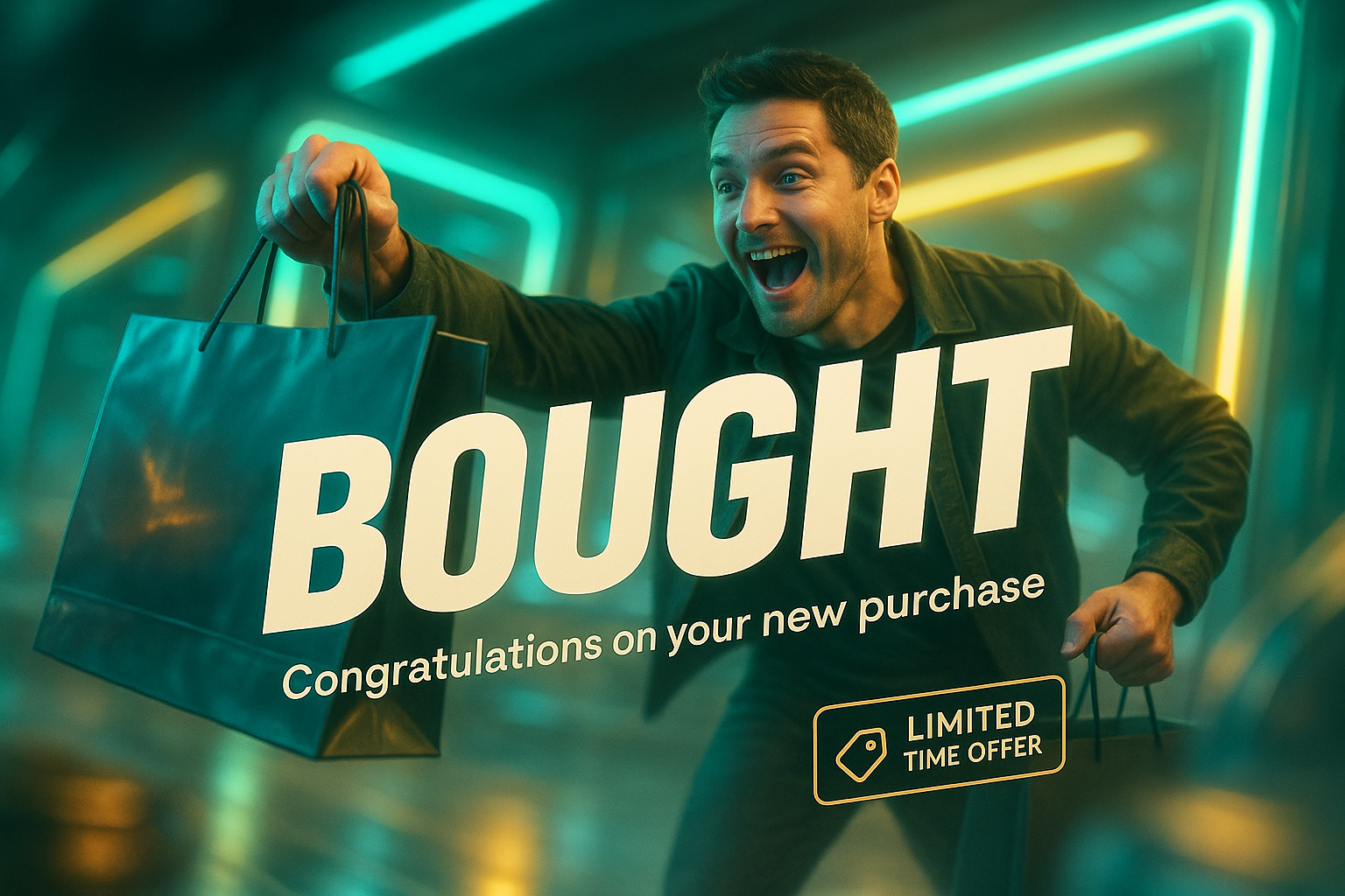 A vibrant carousel slide featuring a joyful man celebrating a purchase, surrounded by neon accents and a misty background, designed for promotional purposes.