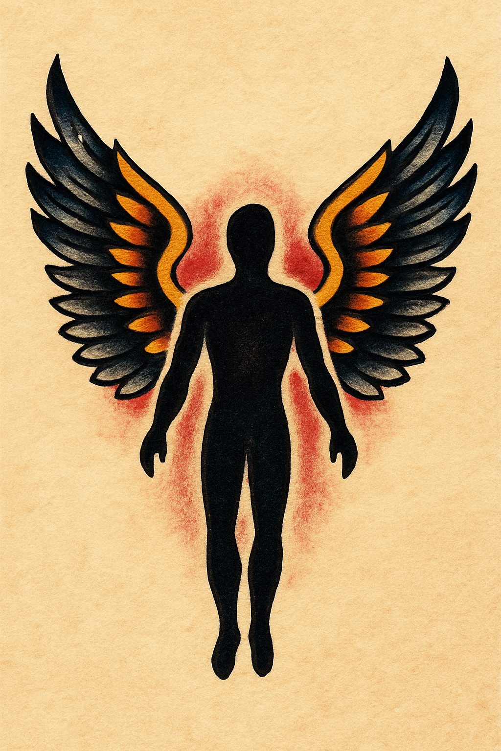 A striking tattoo design featuring a silhouette of a human figure with detailed shadow wings in black and orange, set against a soft beige background.