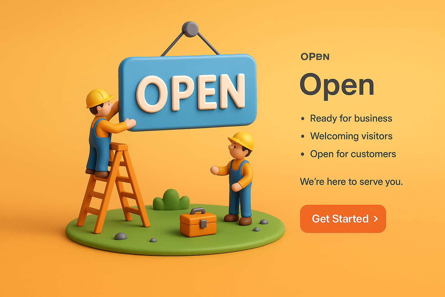 /Collection: /by davooda/Type: PNG/A vibrant 3D scene depicting miniature figures setting up an 'OPEN' sign. The background features a smooth gradient with lively colors, creating an inviting atmosphere. Ideal for illustrating business readiness.