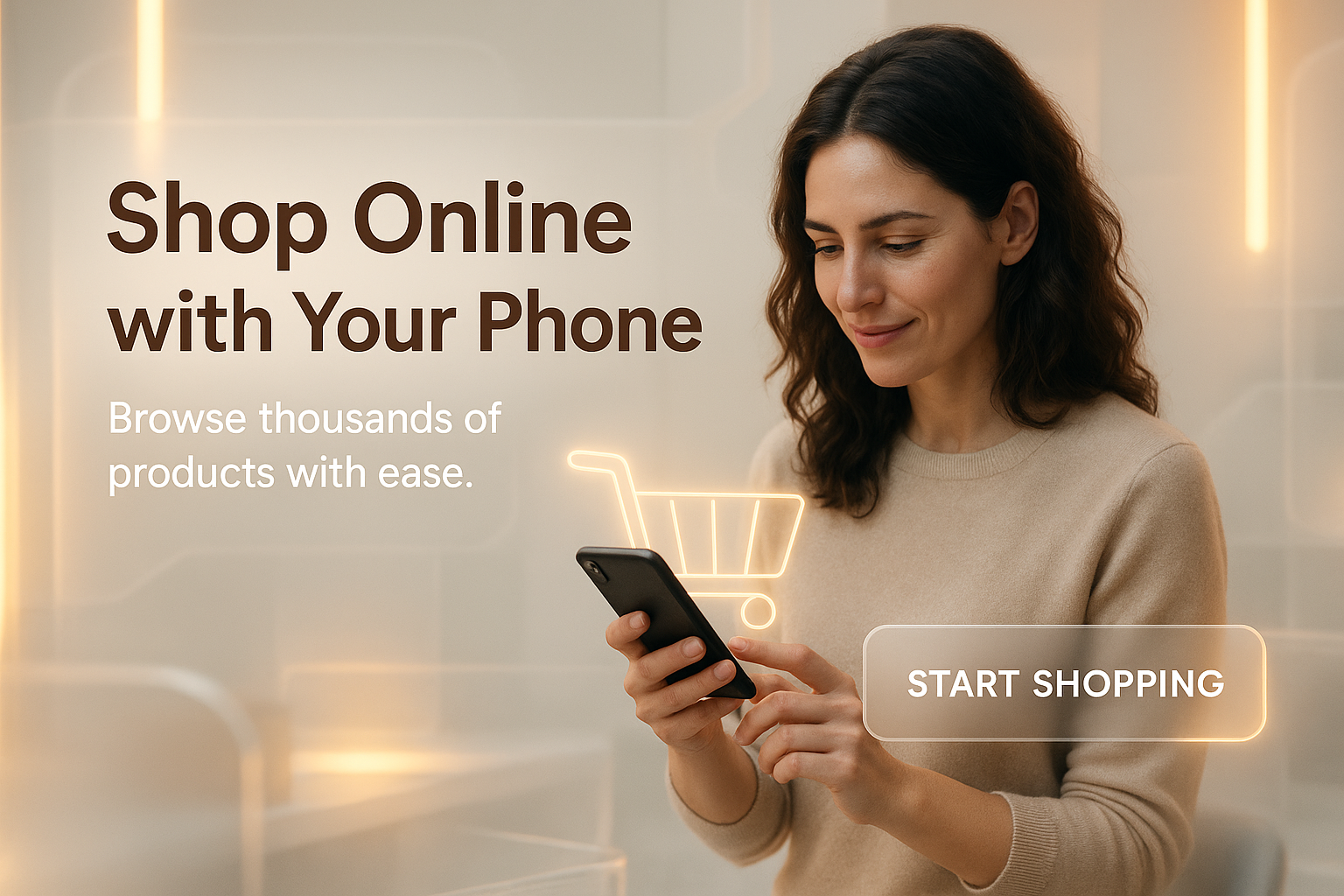 Engaging promotional graphic showcasing a woman using her phone to shop online, featuring modern design elements ideal for e-commerce marketing.