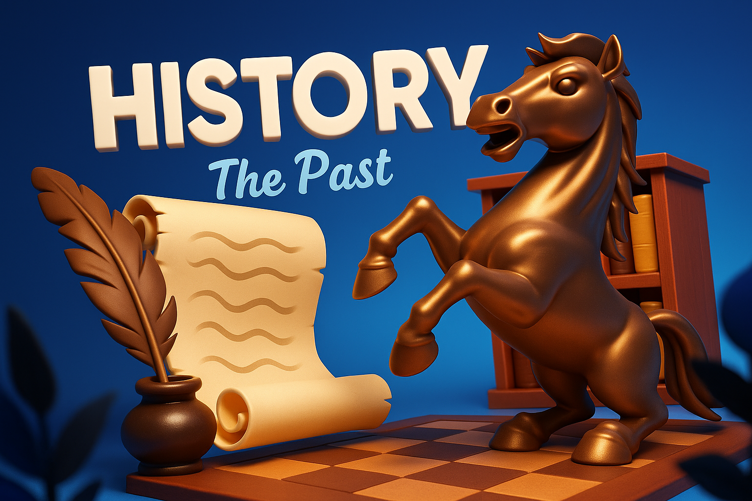 A vibrant 3D illustration showcasing historical elements like a horse and scroll, with a layered composition and engaging typography, set against a smooth gradient background.