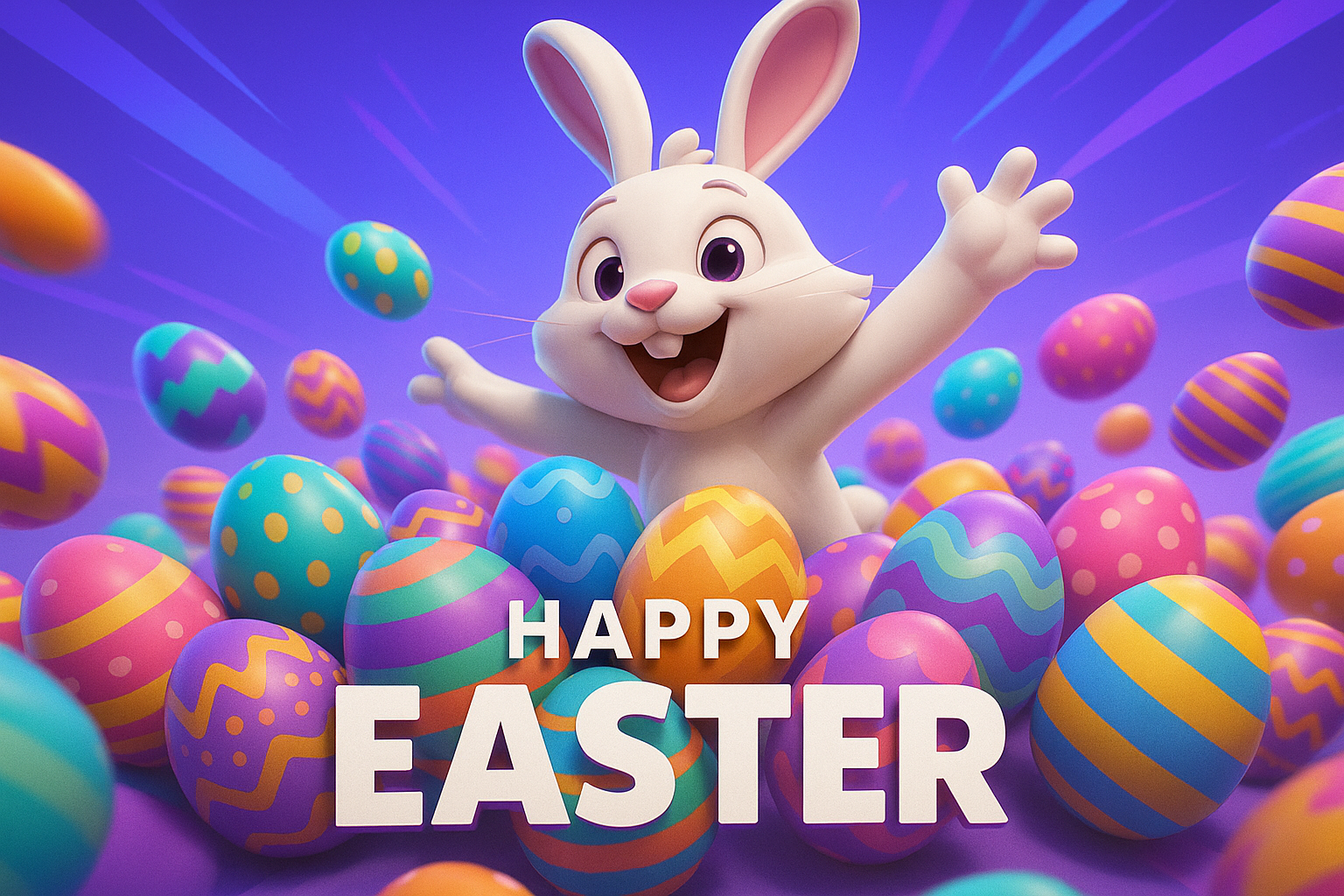 /Collection: /by davooda/Type: PNG/A cheerful Easter bunny joyfully surrounded by a variety of colorful eggs. The dynamic composition features vibrant colors and a playful atmosphere, perfect for celebrating the holiday.
