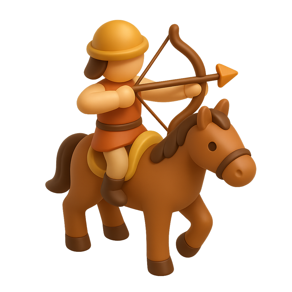 A stylized 3D icon of a horse archer in a three-quarter view, featuring a simplistic design. The archer, wearing a helmet, is poised with a bow and arrow atop a brown horse, set against a softly glowing background.