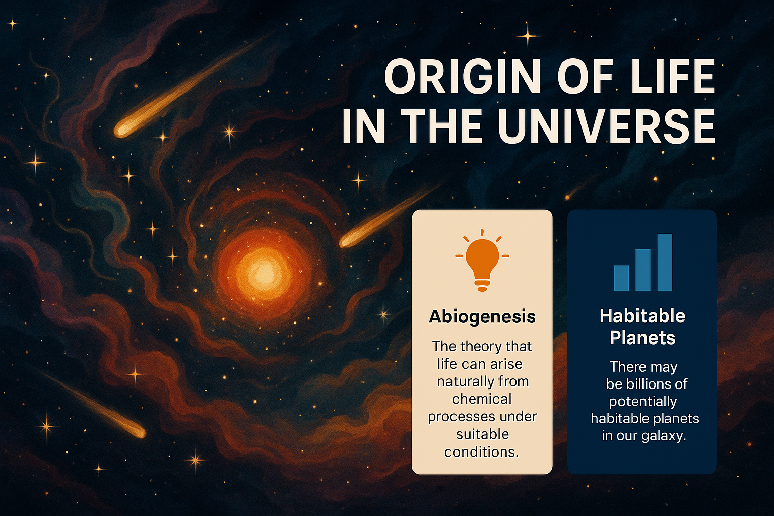 A visually captivating cosmic illustration depicting the concept of life's origin in the universe, featuring celestial elements and informative text boxes. Ideal for educational content on astrobiology.