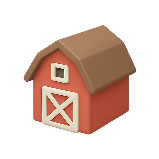 A stylized 3D model of a barn featuring a red body and brown roof, ideal for use in agricultural themes, children's media, or educational content. The design is simple and playful.
