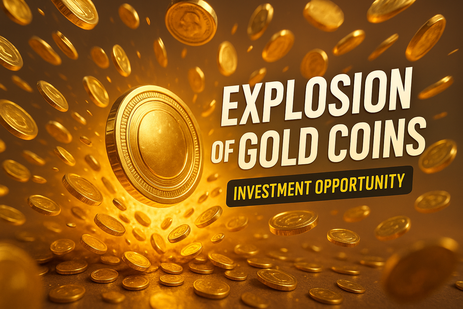 A visually striking graphic illustrating an explosion of gold coins, symbolizing investment opportunities. The design is modern and engaging, suitable for financial marketing.