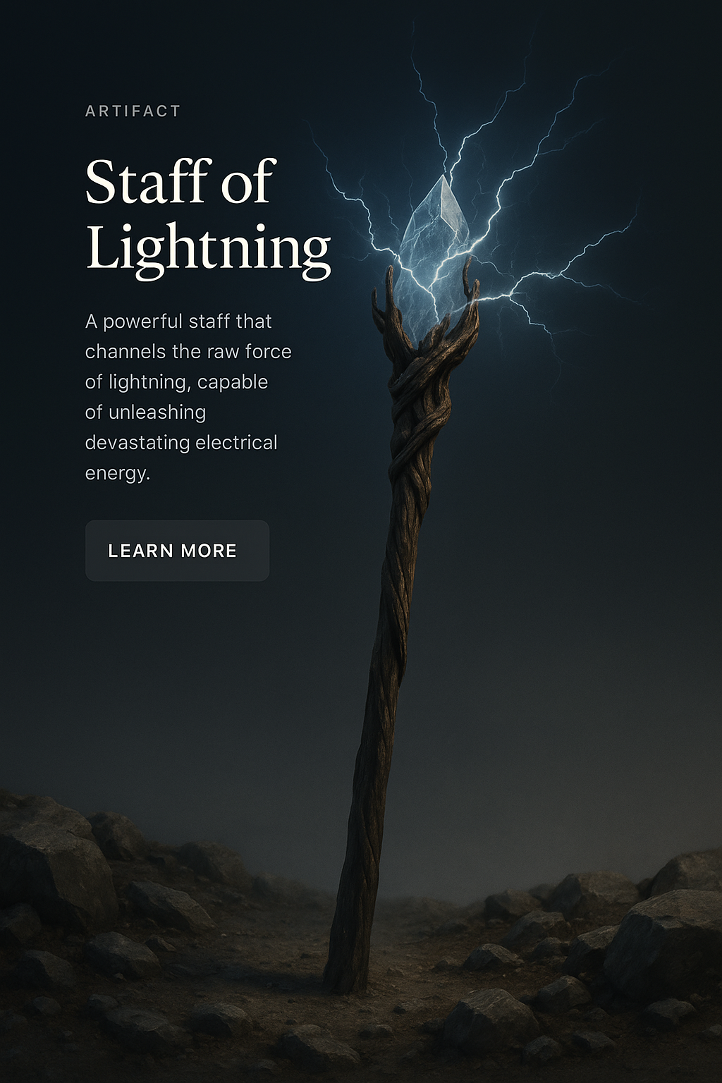 /Collection: /by davooda/Type: PNG/A visually striking illustration of a staff channeling lightning energy, set against a dark gradient background, with a call-to-action button and descriptive text overlay.