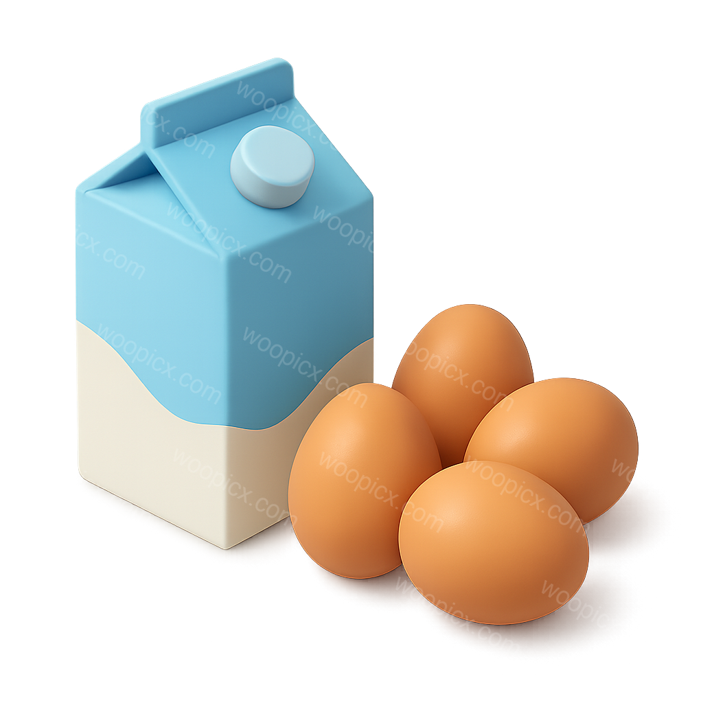 A visually appealing 3D icon featuring a milk carton and four eggs. The carton is in a blue and white design, while the eggs are a warm, orange hue, all set against a gradient background.