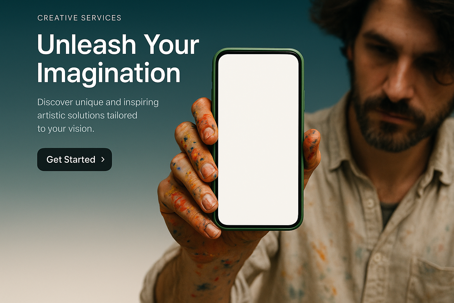 /Collection: /by davooda/Type: PNG/A creative artist showcases a green phone in a stylish pose, surrounded by a minimalistic gradient background. The phone's white screen invites inspiration, while the artist's paint-splattered hands emphasize creativity.