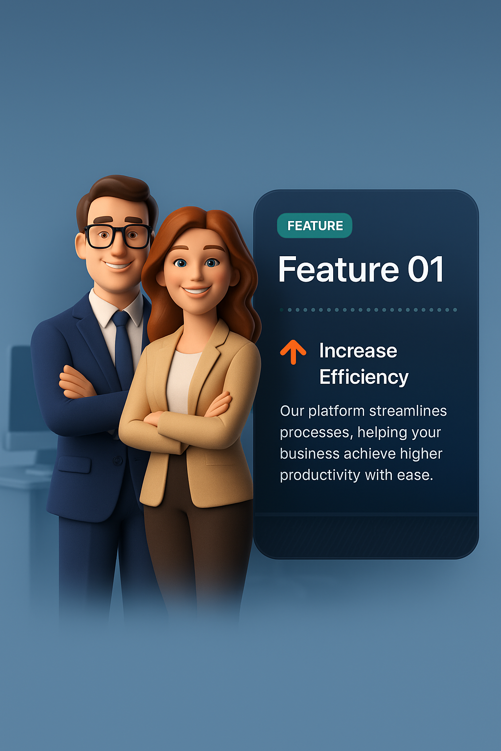 /Collection: /by davooda/Type: PNG/A male and female business couple pose confidently in a modern office, smiling at the camera. The scene features a 3D illustration with a gradient background and a sleek design highlighting efficiency.
