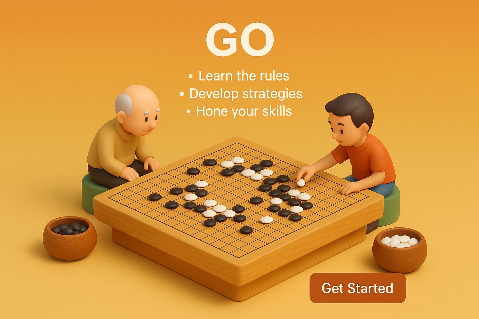 A vibrant 3D illustration showcasing two characters playing the game of Go on a wooden board. The scene emphasizes a distant perspective, capturing the essence of strategy and engagement in a playful environment.