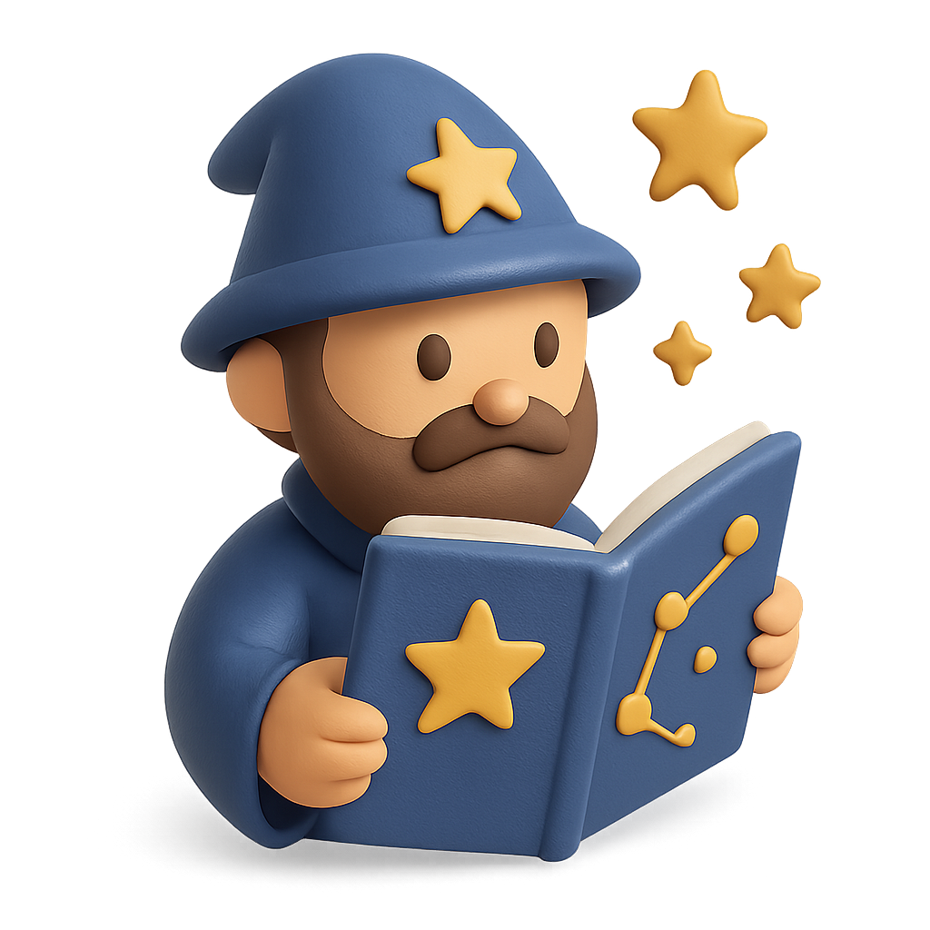 A whimsical 3D icon depicting an astrologer wearing a blue wizard hat adorned with stars, reading a book with celestial symbols, surrounded by floating stars.