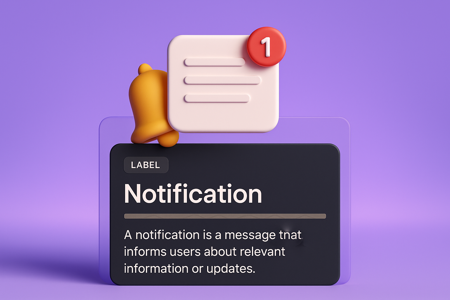 A vibrant 3D design featuring a notification icon and text block. The composition includes a dark panel with a label and a bell, set against a smooth gradient background.