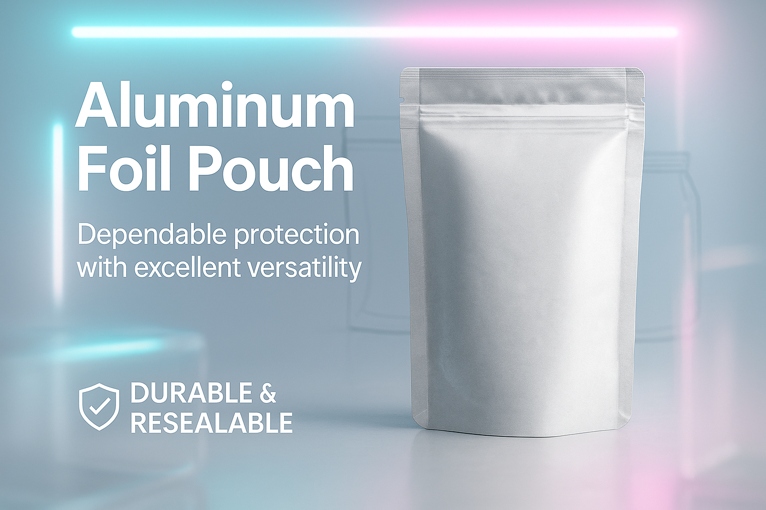 Realistic mockup of an aluminum foil pouch designed for packaging, showcasing its durable and resealable features with a sleek, modern aesthetic suitable for product presentations.