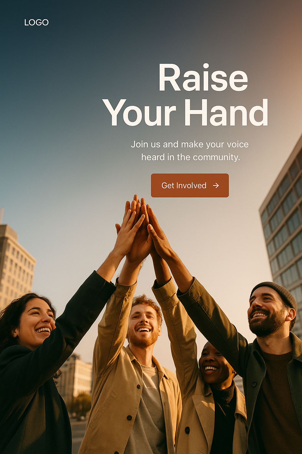 /Collection: /by davooda/Type: PNG/A diverse group of individuals joyfully raising their hands together against a clear sky and urban backdrop. This uplifting scene conveys community engagement and unity.