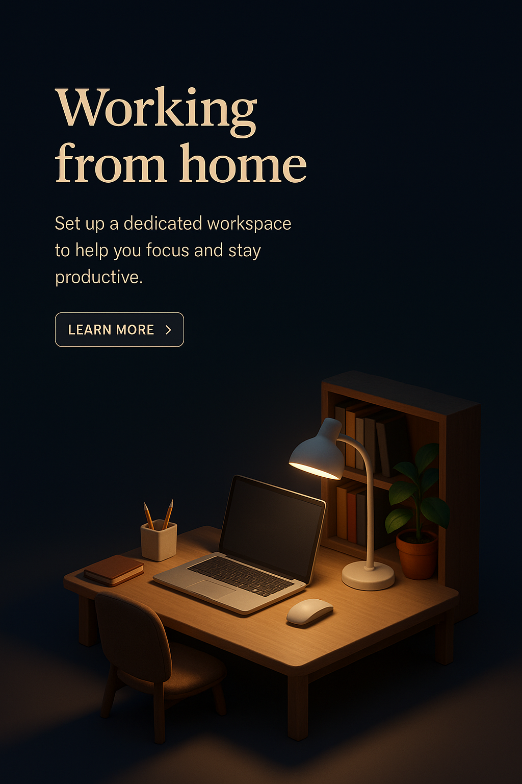 A cozy home office scene featuring a wooden desk, laptop, and desk lamp, all set against a dark gradient background. The design emphasizes realism with a focus on productivity.