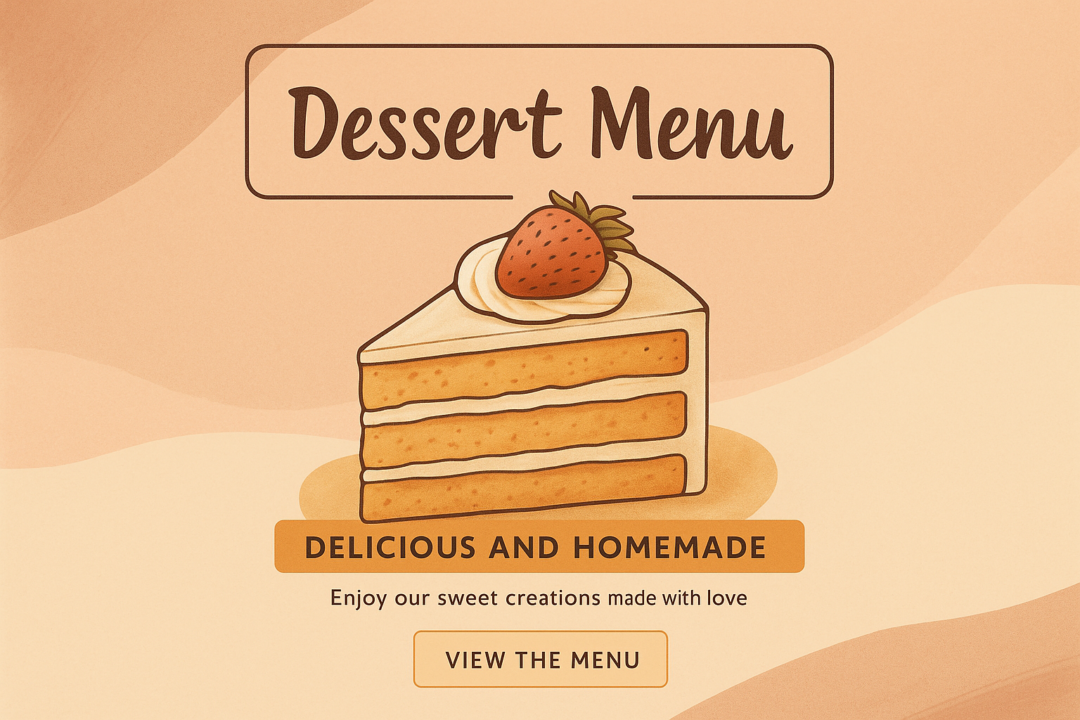 /Collection: /by davooda/Type: PNG/A visually appealing dessert menu slide featuring a layered cake topped with a strawberry. Text elements include 'Dessert Menu' and a call-to-action button, all set against a soft, gradient background.