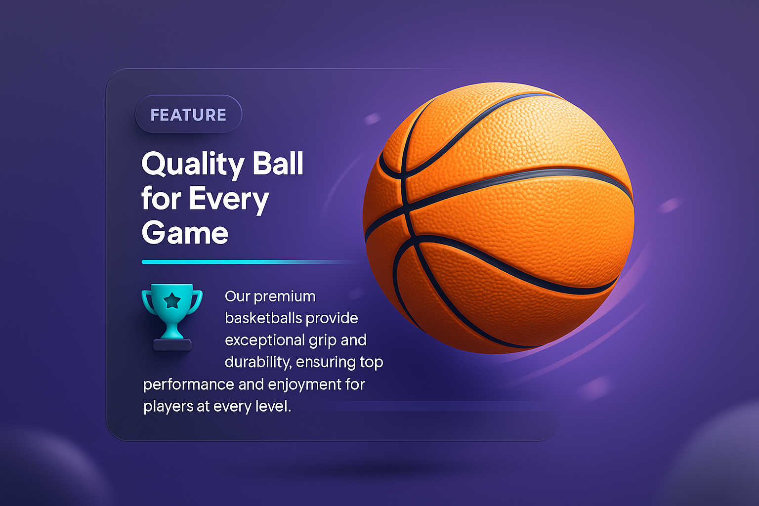 /Collection: /by davooda/Type: PNG/A vibrant 3D basketball placed against a smooth gradient background, featuring a sleek info block highlighting product features. The design emphasizes modern aesthetics.