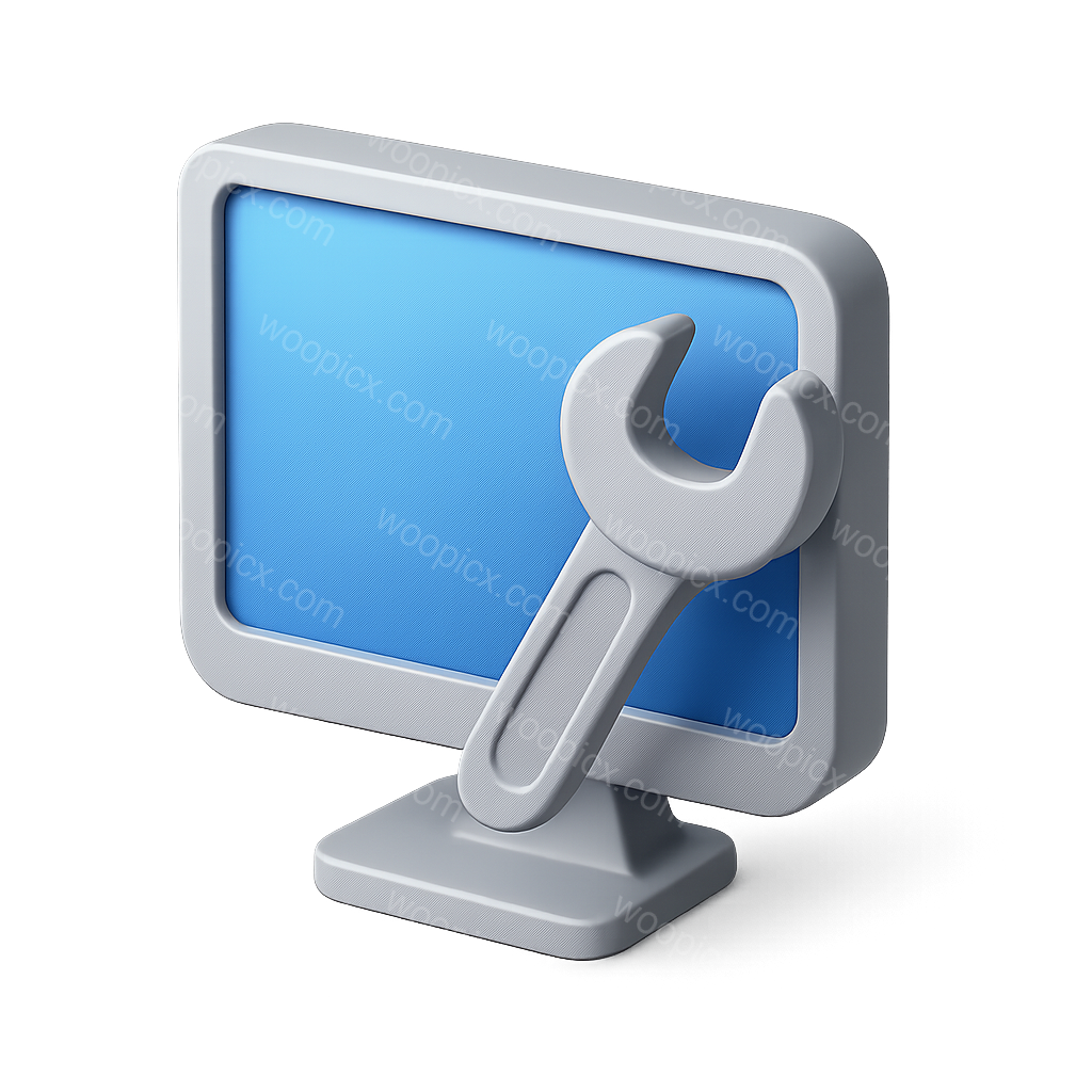 A visually appealing 3D icon featuring a computer screen with a wrench overlay. The design showcases a modern and sleek aesthetic, emphasizing a three-quarter view with a volumetric feel.