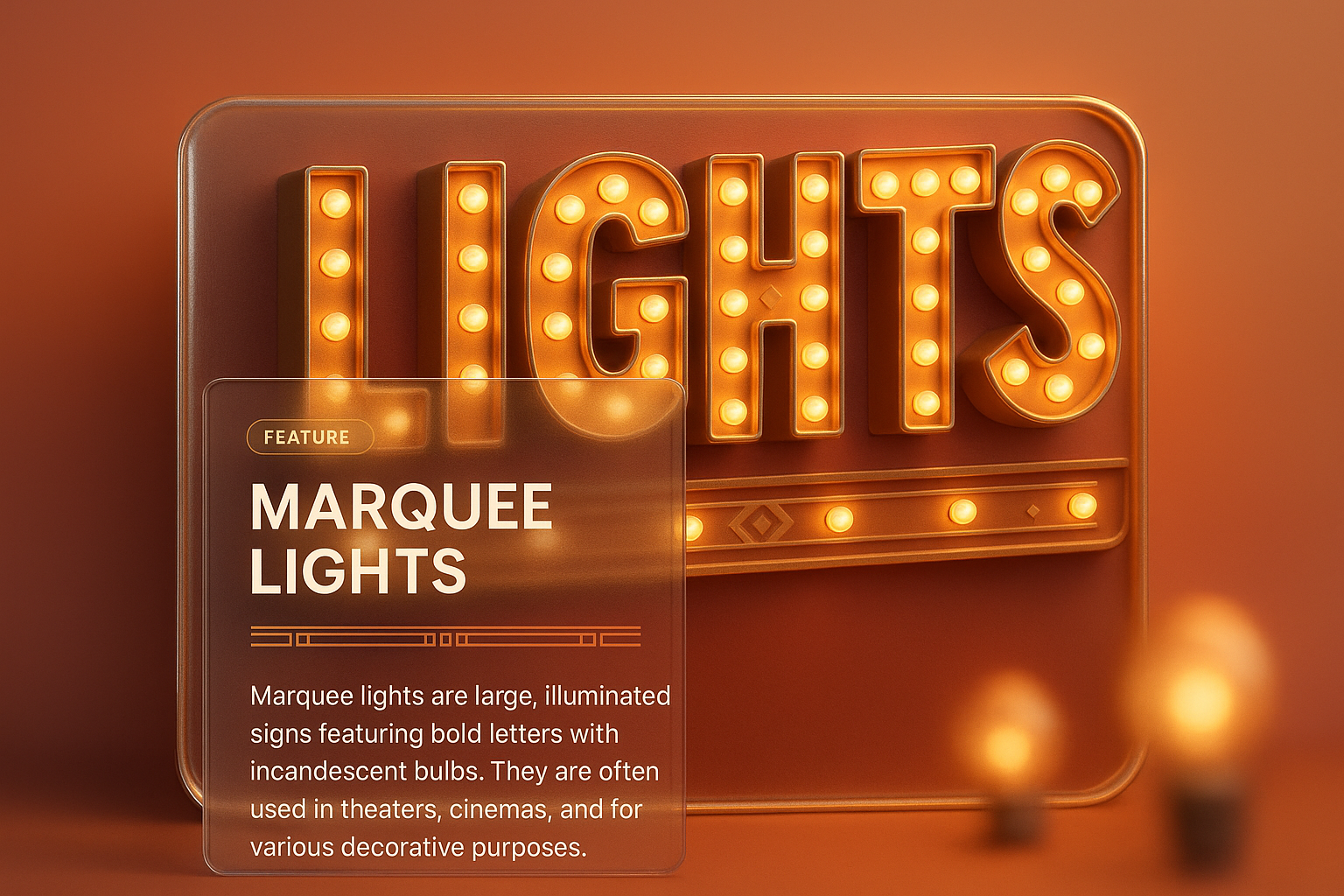 A 3D illustration showcasing marquee lights with an eye-catching glow. The design features bold letters and a transparent text block with descriptive content, perfect for web integration.