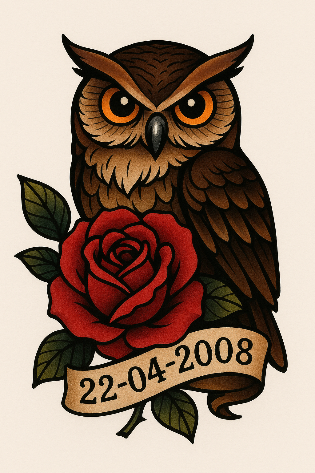A striking tattoo design featuring a stylized owl perched on a vibrant red rose, accompanied by a banner displaying a date. The bold colors and intricate details make it suitable for tattoo enthusiasts and artists.