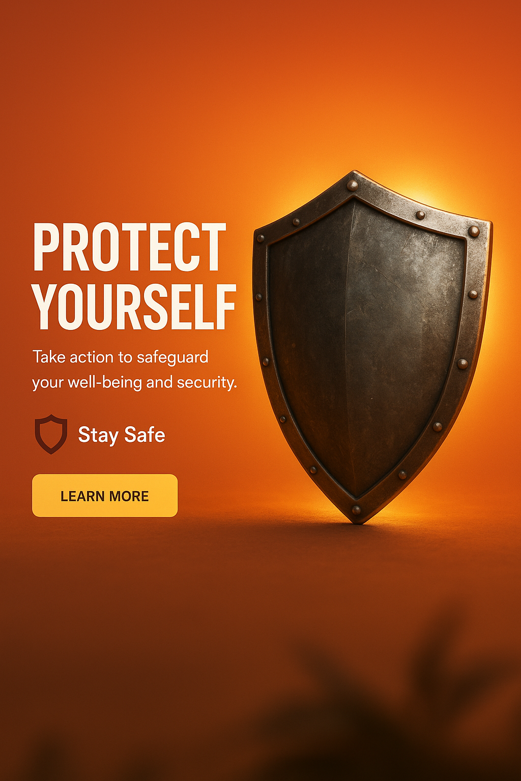 /Collection: /by davooda/Type: PNG/This is a promotional graphic emphasizing personal safety and security. It features a shield icon on an orange background, aimed at engaging an audience interested in self-protection.