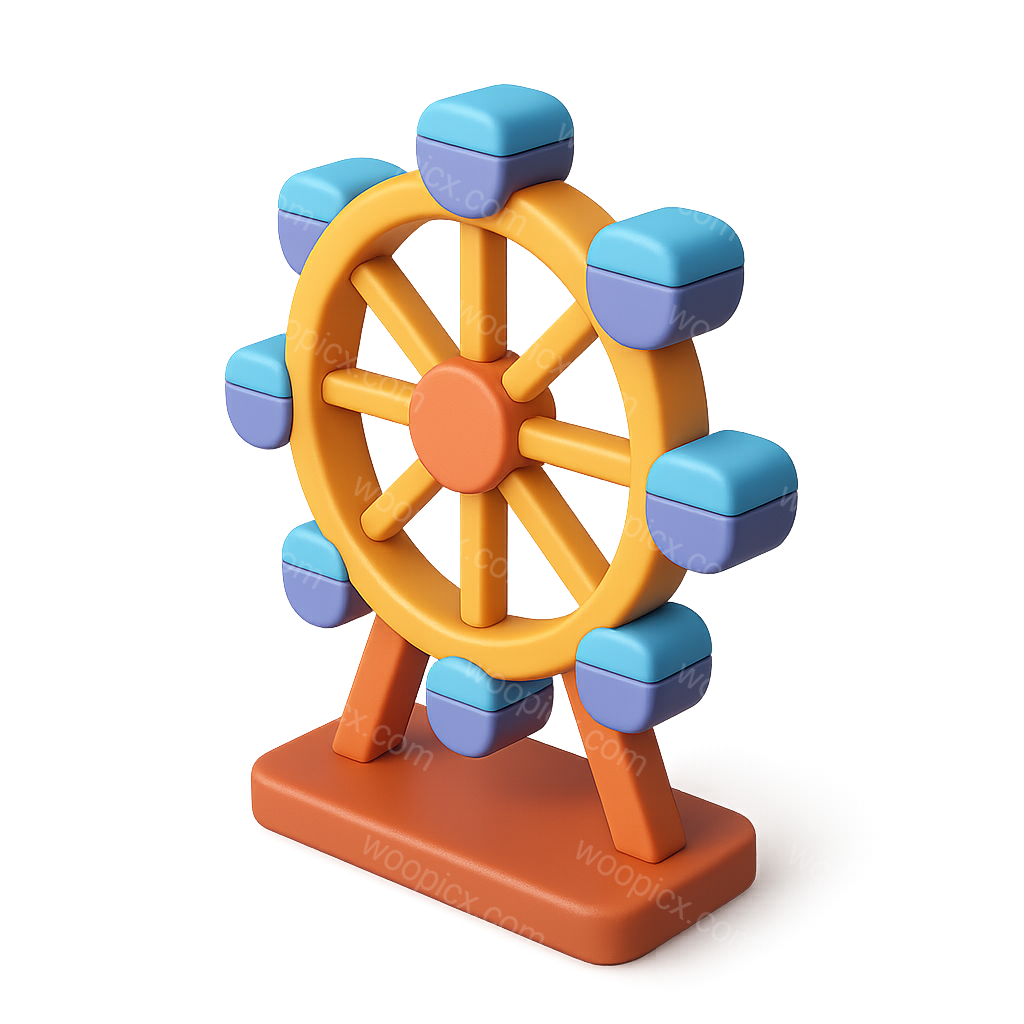 A vibrant 3D icon of a Ferris wheel, featuring an orange base and blue gondolas. The design showcases a playful, isometric view with a glossy finish against a gradient background.