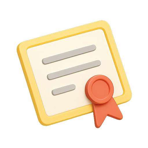 A stylized 3D illustration of a certificate featuring a ribbon seal, designed with soft colors and smooth textures, suitable for educational or achievement-related contexts.