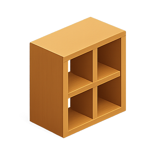 /Collection: /by davooda/Type: PNG/3D illustration of a wooden storage shelf featuring four open compartments, ideal for organizing small items, suitable for furniture design or home decor concepts.