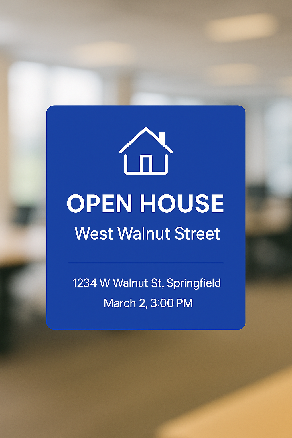 Sleek and modern open house sign featuring essential details such as location and time, ideal for real estate marketing and property showcasing.