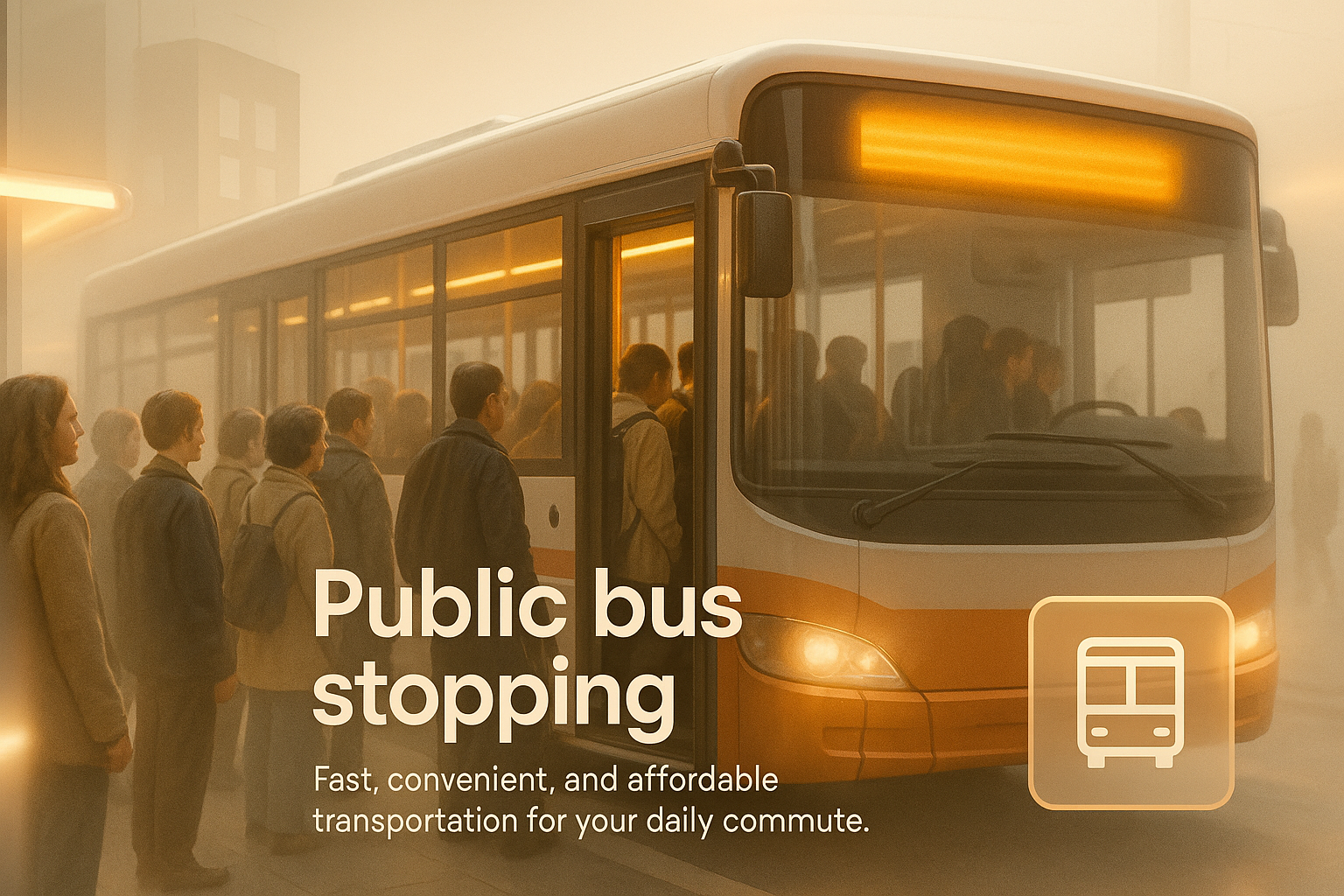 /Collection: /by davooda/Type: PNG/A visually engaging image depicting a public bus stopping to pick up commuters, highlighting the convenience and affordability of public transportation. Ideal for urban transport campaigns.