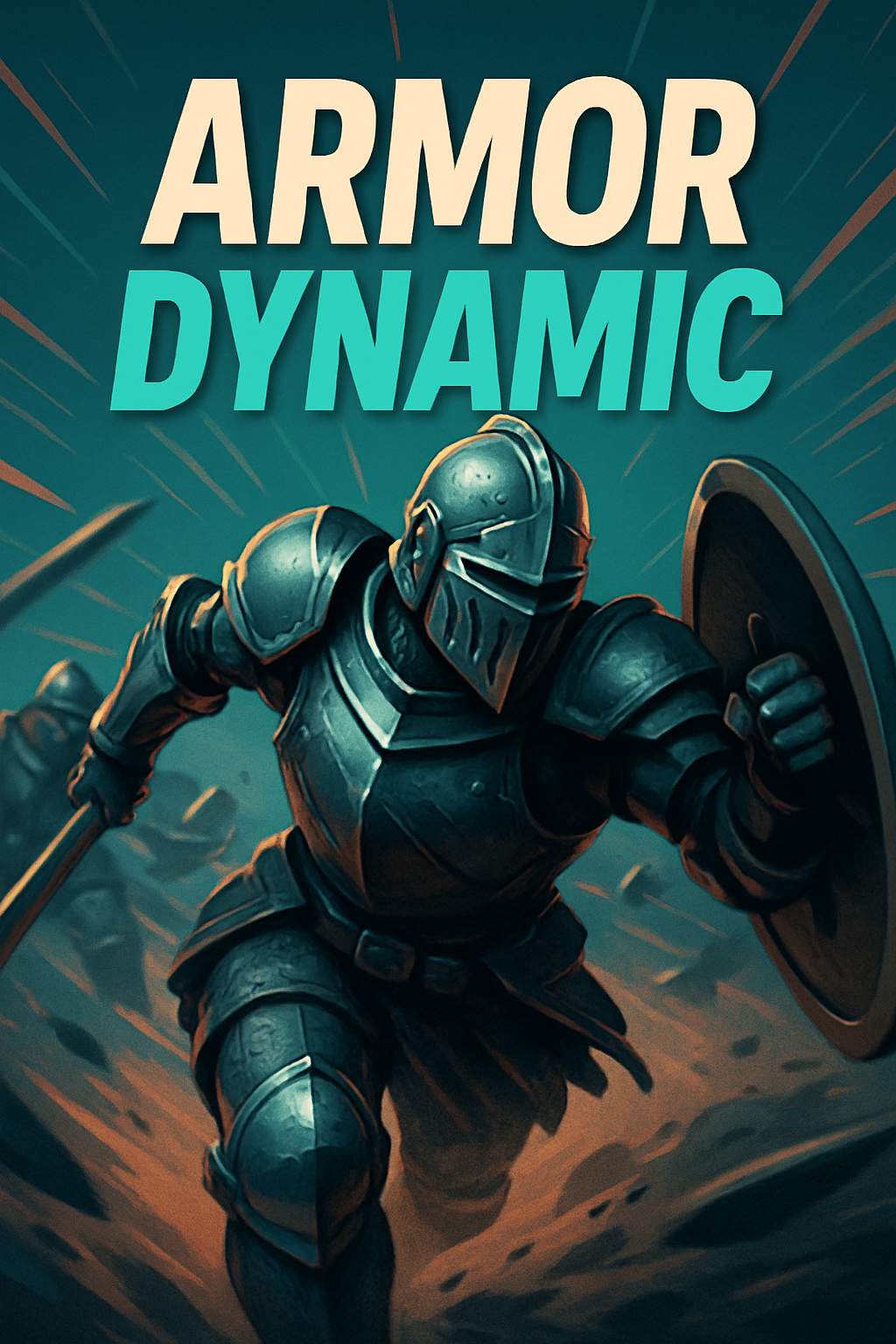 Dynamic Armor Illustration with Bold Typography and Action Elements