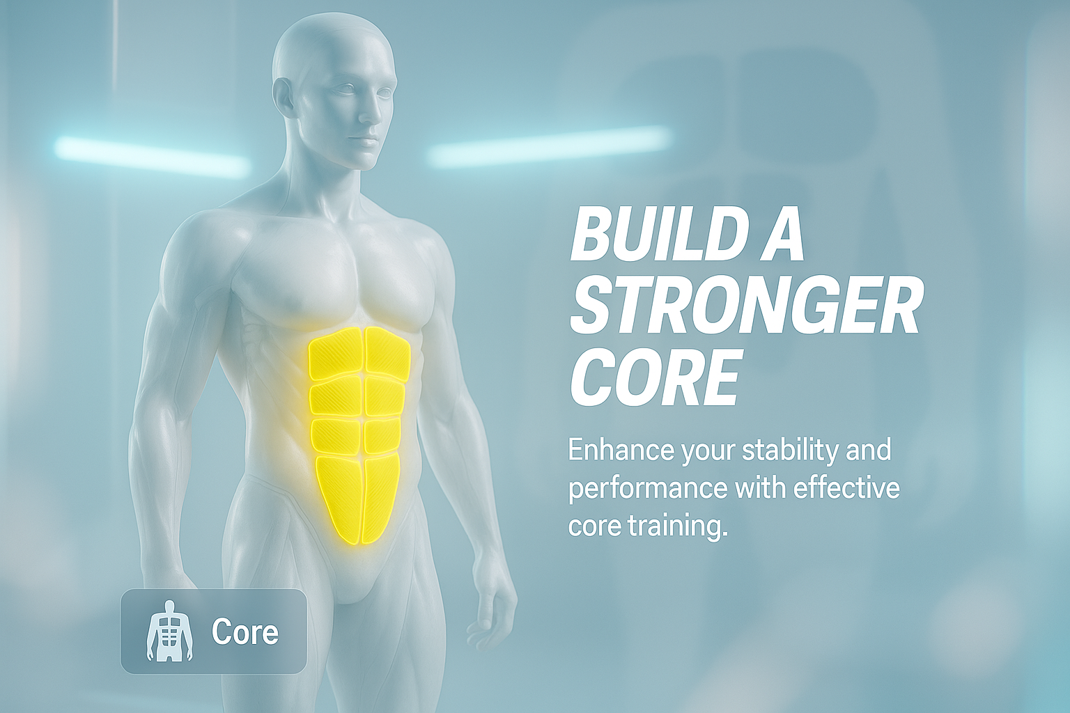 A visually engaging fitness graphic emphasizing core strength training with a stylized human figure, ideal for gym promotions or workout guides.