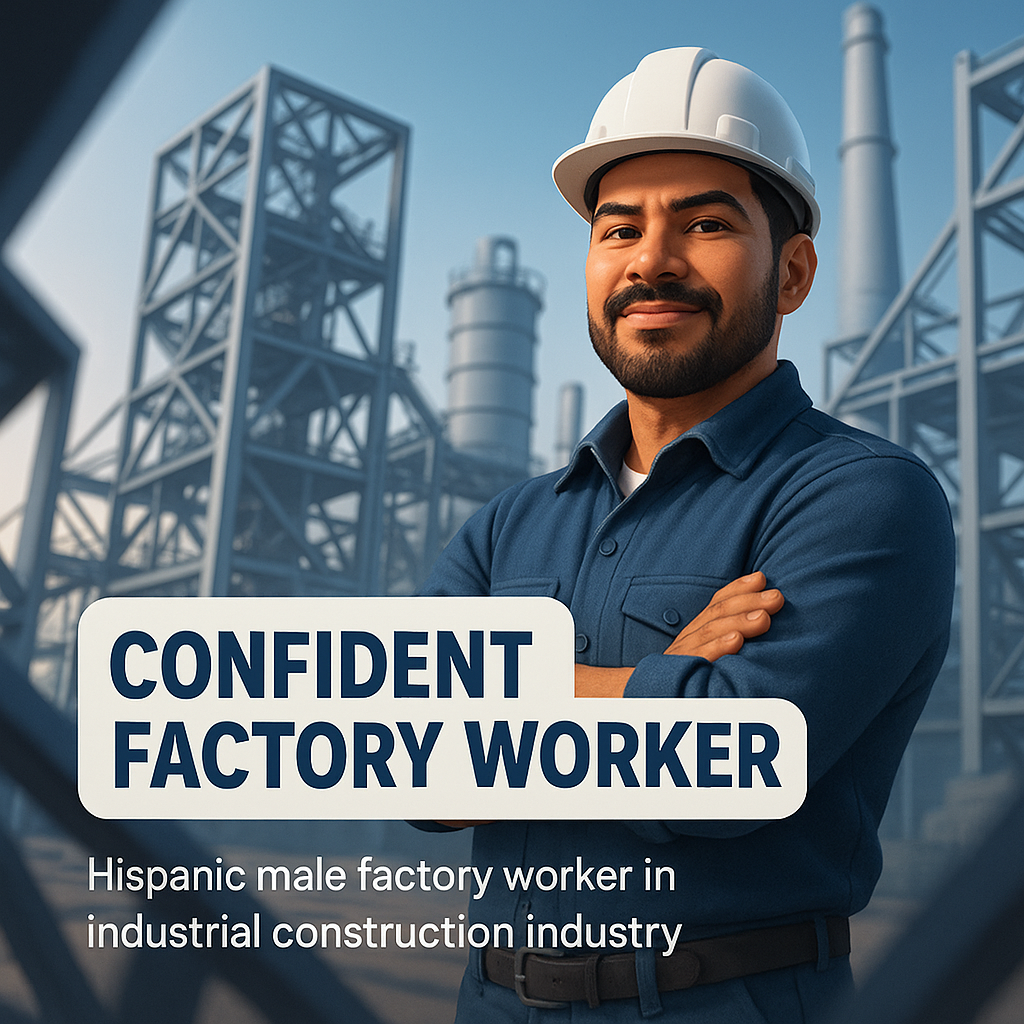 /Collection: /by davooda/Type: PNG/A portrait of a confident Hispanic male factory worker in an industrial construction setting. The image features a blend of professional attire and a modern industrial background, suitable for workforce-related content.