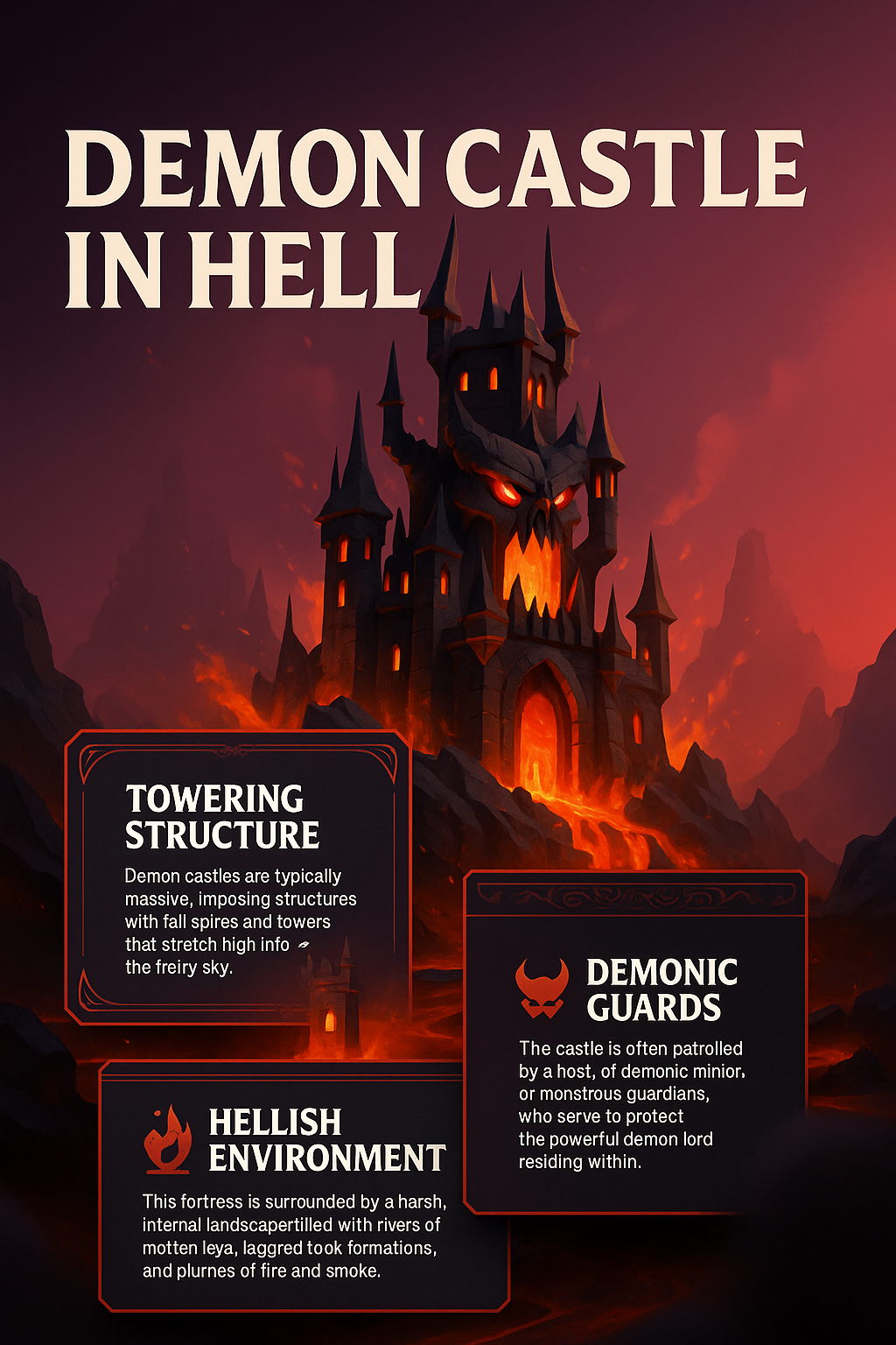 A striking 3D illustration of a massive demon castle set in a hellish landscape, featuring fiery elements and dark towers, embodying a sense of foreboding.