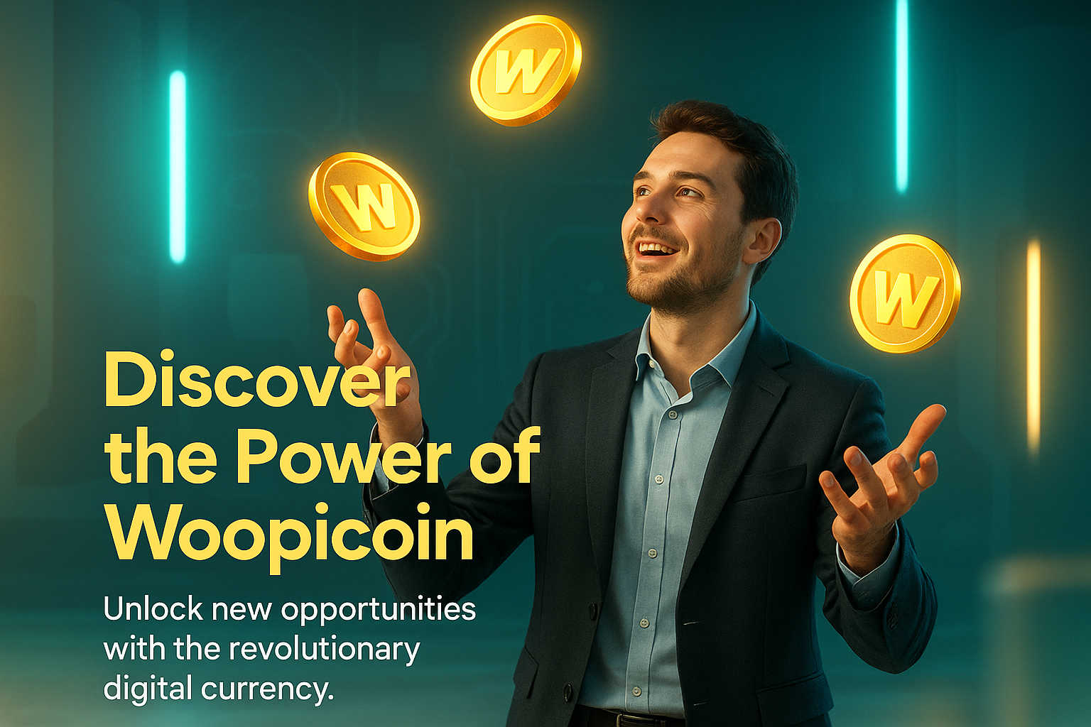 Engaging promotional image featuring a man showcasing Woopcoin, a digital currency. The modern design and vibrant colors aim to attract tech-savvy audiences interested in cryptocurrency.
