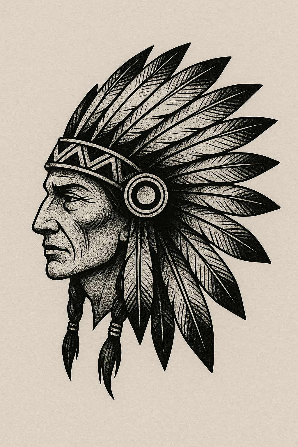 Artistic Illustration of a Native American Chief with Feathered Headdress