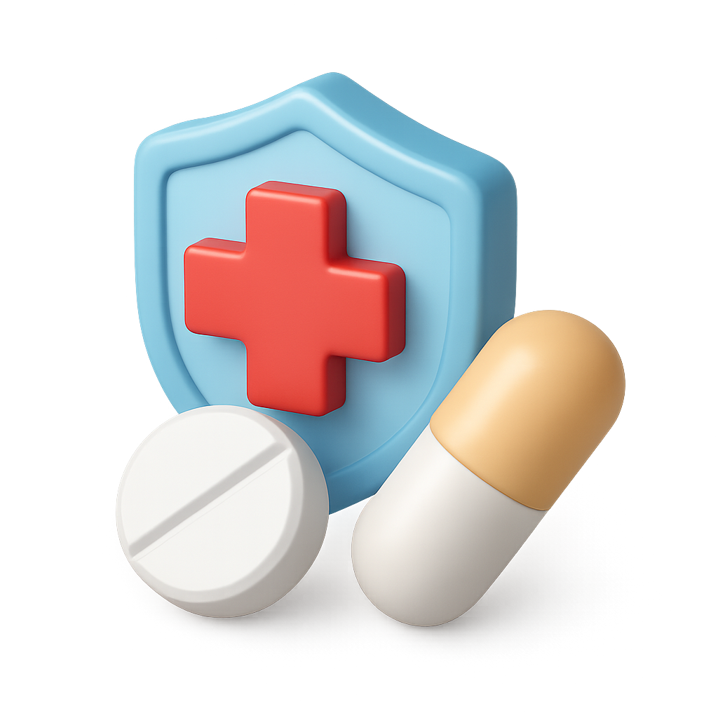 A vibrant 3D icon featuring a blue shield with a red cross, alongside a white pill and a capsule. The design is isometric and volumetric, showcasing a modern take on medical symbols.