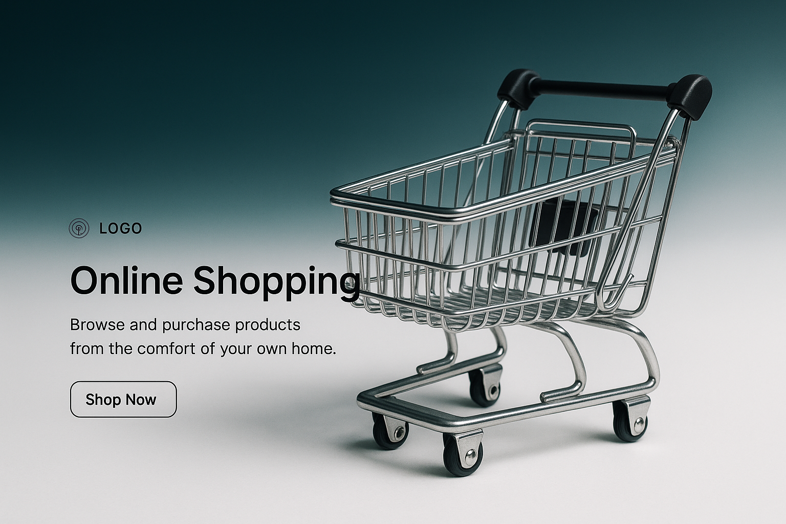 A sleek and modern shopping cart icon set against a two-tone gradient background. The cart is detailed and realistic, symbolizing online shopping with an inviting call to action.