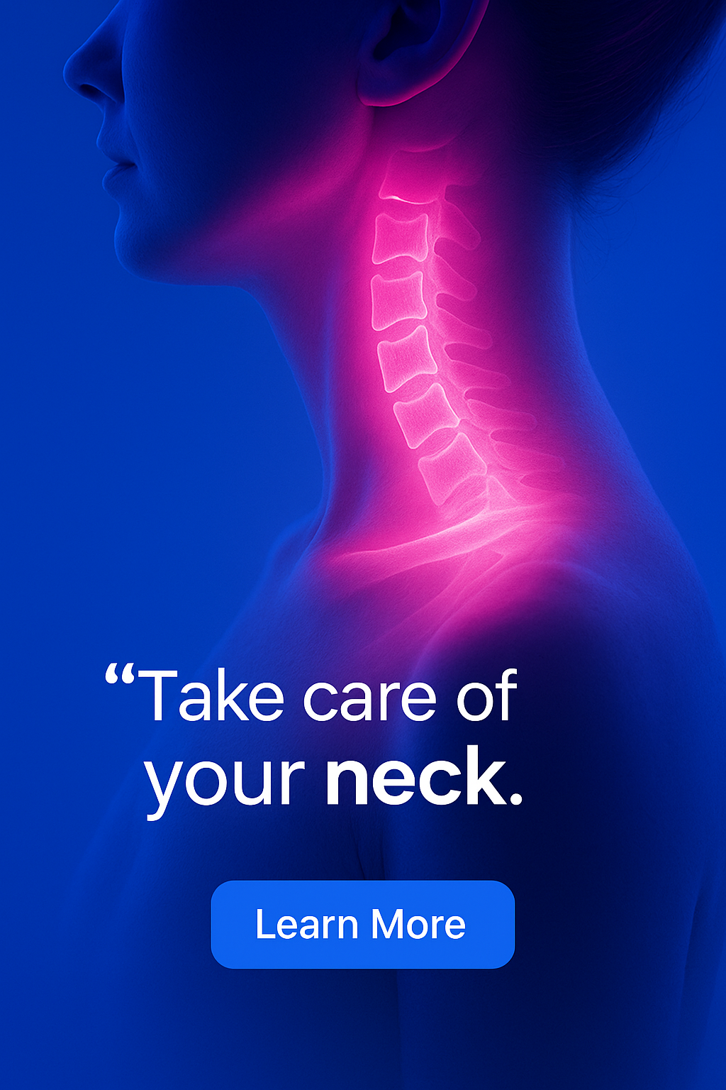 A glowing neck illustration with a neon-pink luminescence emanating from a semi-transparent area. The background is a solid blue, enhancing the vibrant glow while the text emphasizes neck care.