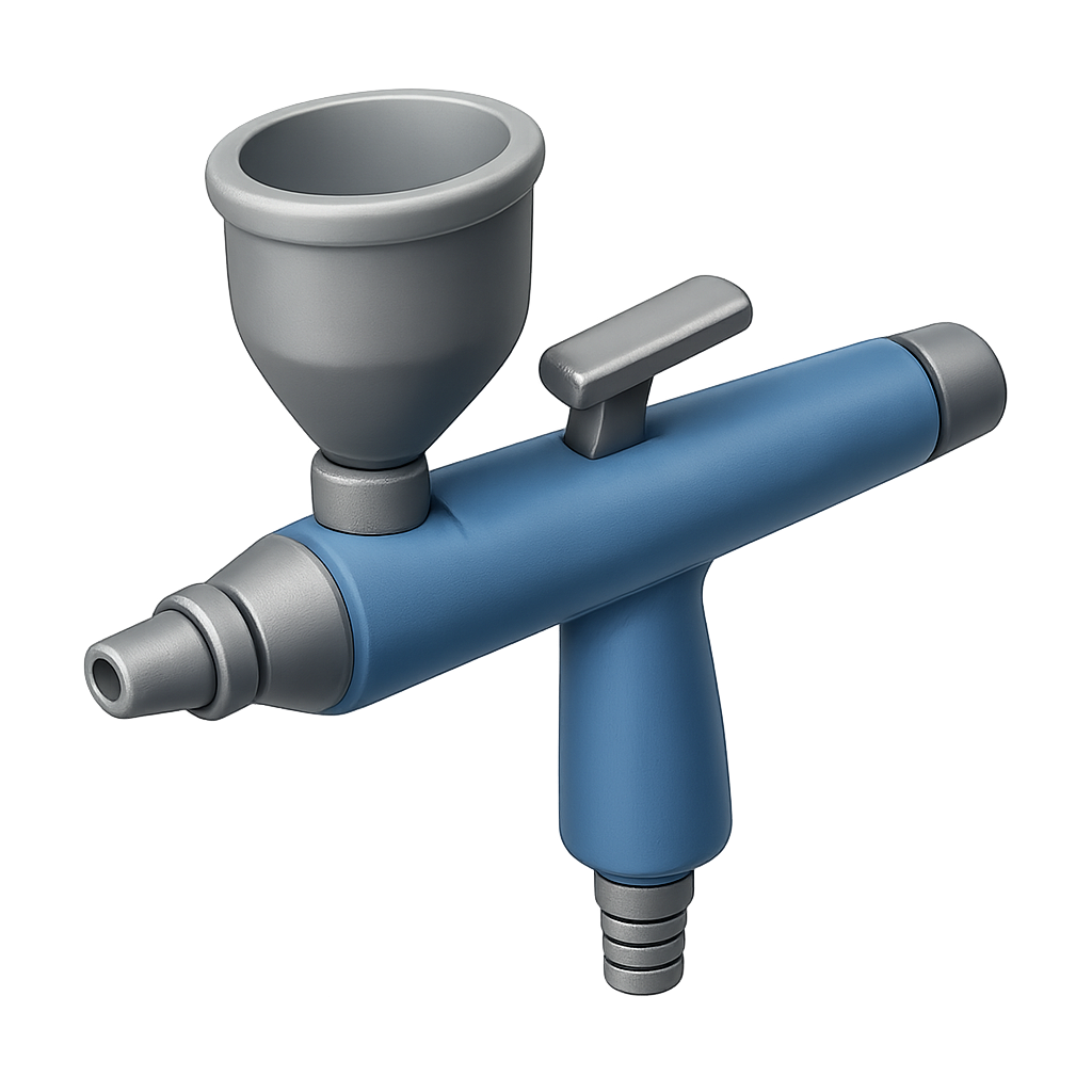 A visually striking 3D airbrush icon showcasing a blue and gray airbrush with a sleek design. The isometric view emphasizes its volumetric features against a subtle gradient background.