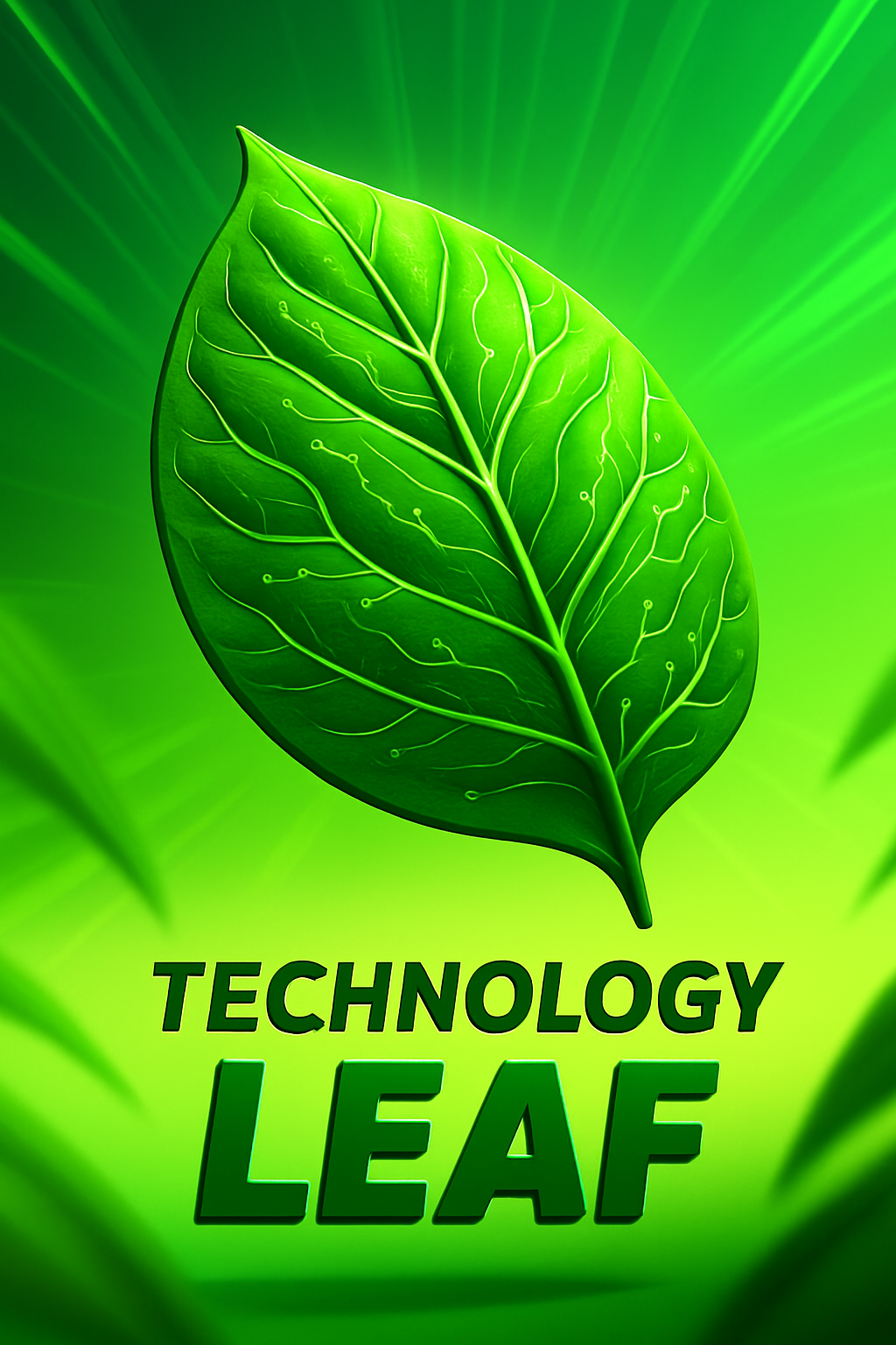 A striking illustration of a vibrant green leaf showcasing intricate textures and details. The design features a smooth gradient background and dynamic lines radiating from the center, enhancing the visual appeal.