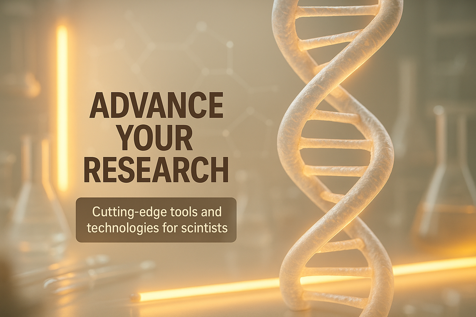 /Collection: /by davooda/Type: PNG/Visually engaging promotional image showcasing a 3D DNA model with a laboratory backdrop, ideal for highlighting scientific tools and technologies aimed at researchers.