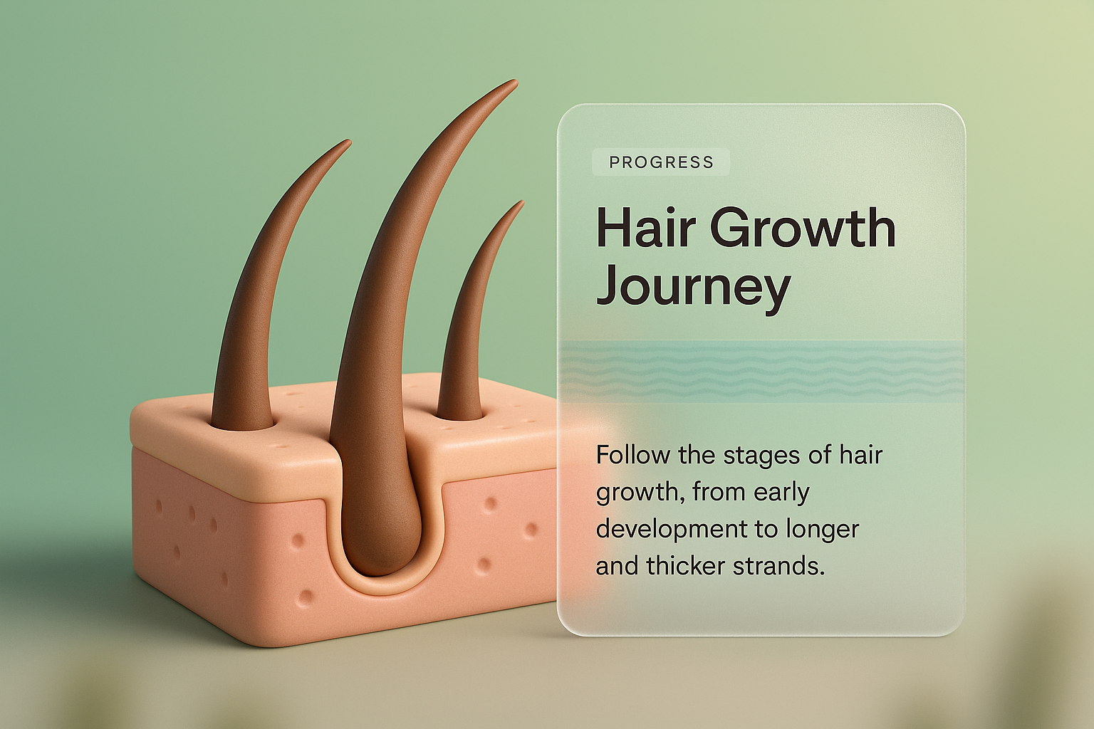 /Collection: , /by davooda/Type: PNG/A detailed 3D illustration showcasing hair growth stages, featuring a textured block with a transparent overlay containing descriptive text and a progress label.