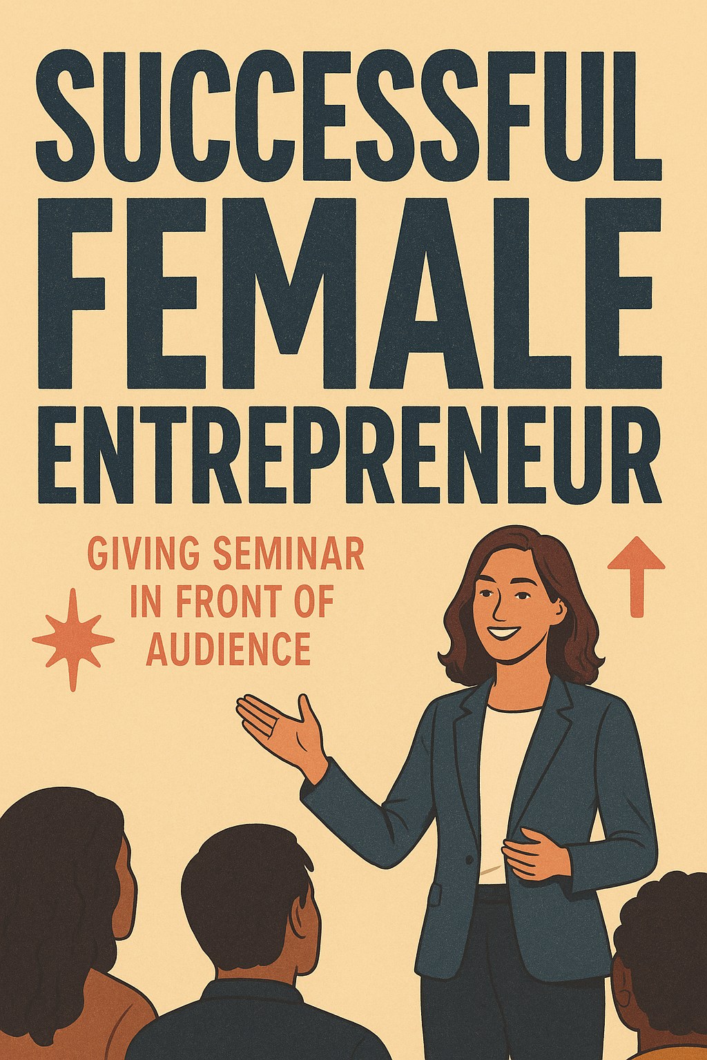 An engaging graphic depicting a confident female entrepreneur presenting to an audience, ideal for promoting seminars or workshops focused on female leadership and entrepreneurship.